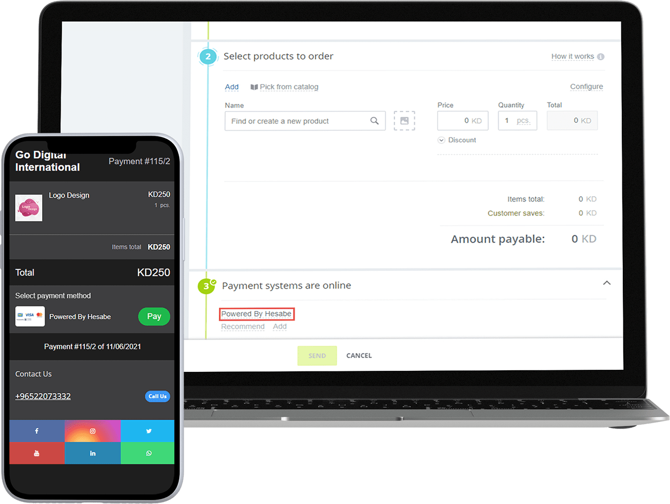 Streamline your payment process with CRM Payment, a powerful feature designed to simplify payment collection for your team. With seamless integration into Hesabe, employees can effortlessly create deals or invoices and generate a customized checkout page. This page includes all the essential details, such as products, total prices, and a Hesabe payment button, which can be shared via SMS, WhatsApp, or other channels to collect payments directly from customers.